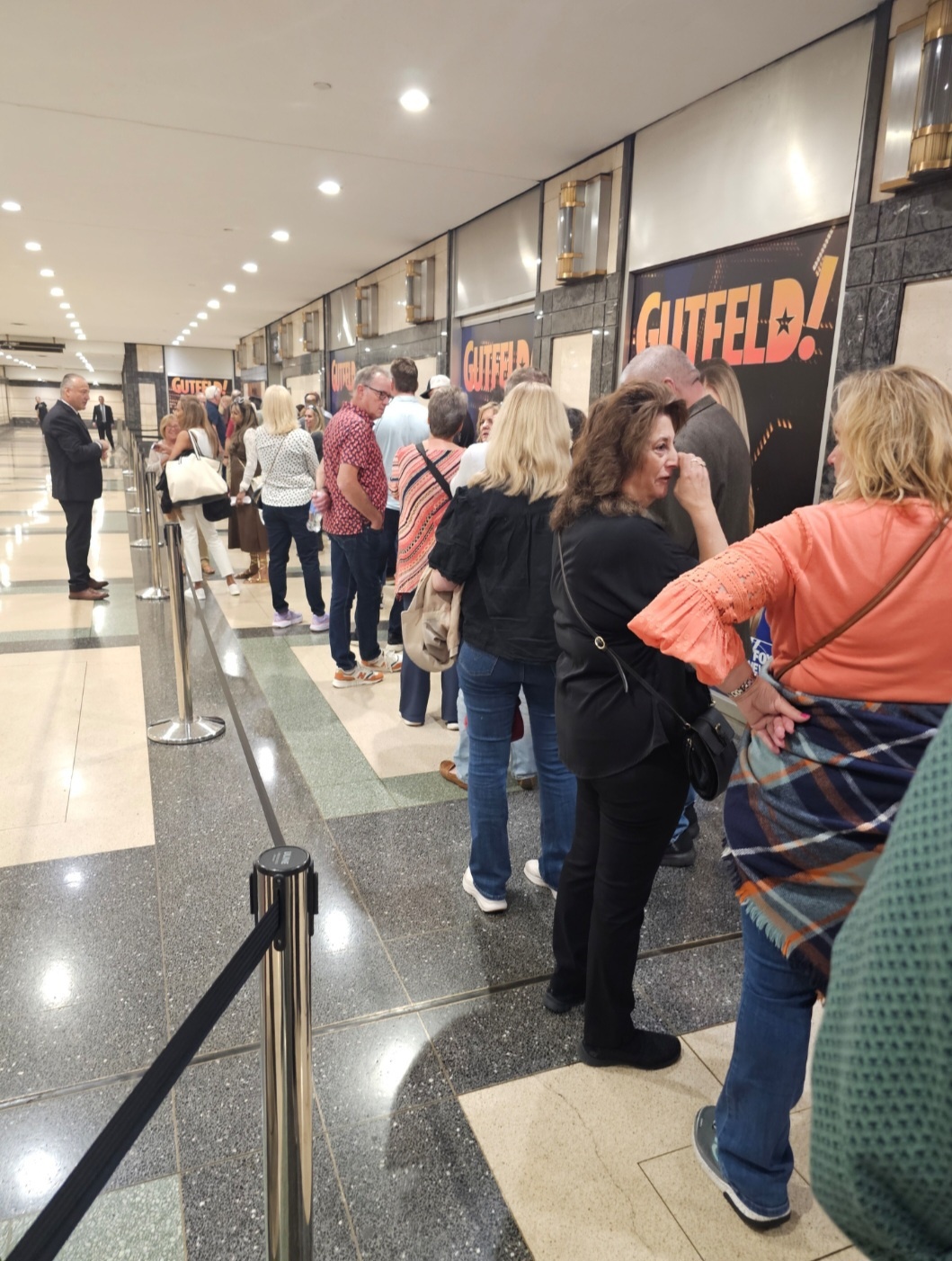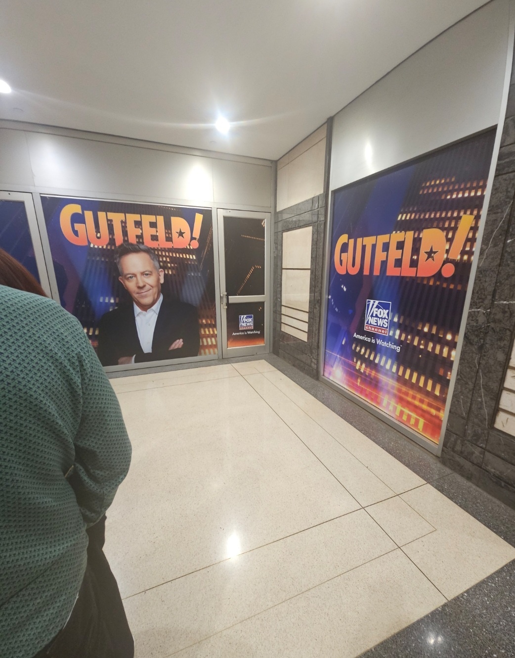 Here are some pix from the Gutfeld visit. There are no pix of the host or guests as you have to shut down phones during the show. The show is still in the same studio but due to construction the entrance is at the opposite corner of the property, kind of at the subway entrance and leads to a winding underground route to the previous waiting area. There is ample security including a physical bag check, airport level walk thru metal detector, wanding, and body cavity check. There is a stern warning on taking a 5 finger discount with the gutfeld seat back covers. Shame Shame Shame, were not those people. Gabi is excellent and efficient on processing guests into the show. Gene provides an excellent warm up and content between blocks.