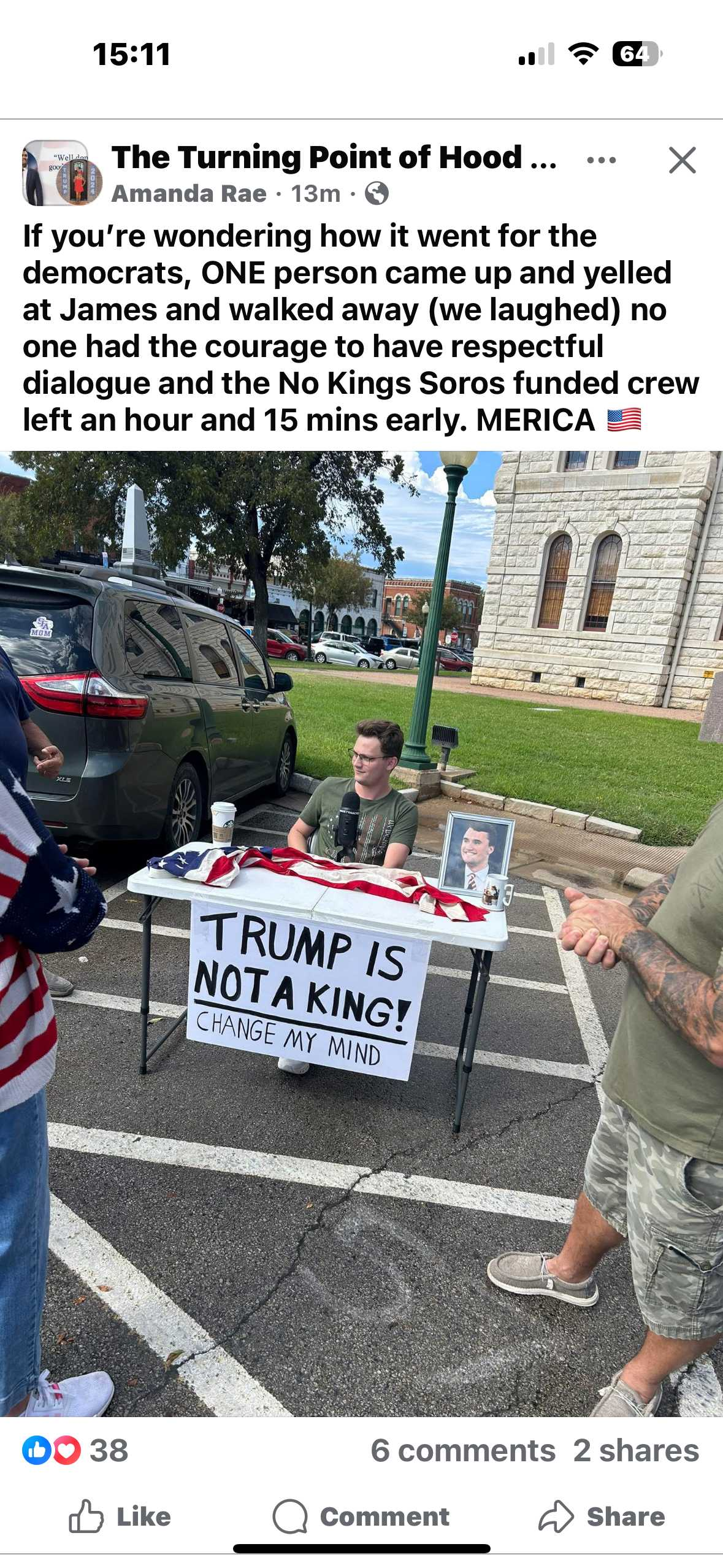 “If you're wondering how it went for the democrats, ONE person came up and yelled at James and walked away (we laughed) no one had the courage to have respectful dialogue and the No Kings Soros funded crew left an hour and 15 mins early.” BAHHAHAAHAAHAHA!