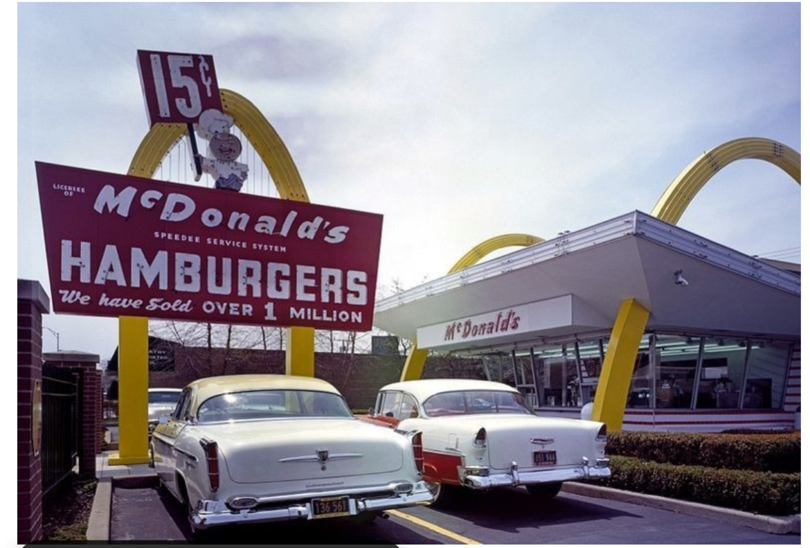 I had my first McDonald’s hamburger at the first McDonald’s. Before “Happy Meals” and Ronald McDonald. Yes, I’m that old and take out was either McDonalds or “Chicken Delight” when mom didn’t cook (almost never).