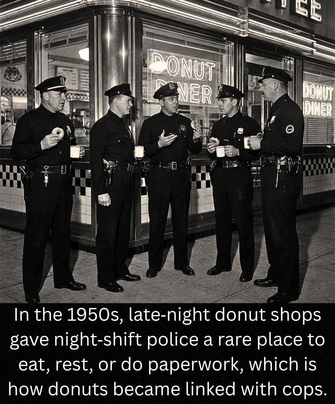 Donut shops didn’t become cultural shorthand for police officers by accident. In the 1950s, most American cities had very few food businesses open past midnight. Diners often closed early, and fast‑food chains hadn’t yet taken over the landscape. Donut shops, however, needed to bake through the night so fresh pastries would be ready by morning. That meant their lights were on, the coffee was hot, and the doors were open when almost everything else was dark.