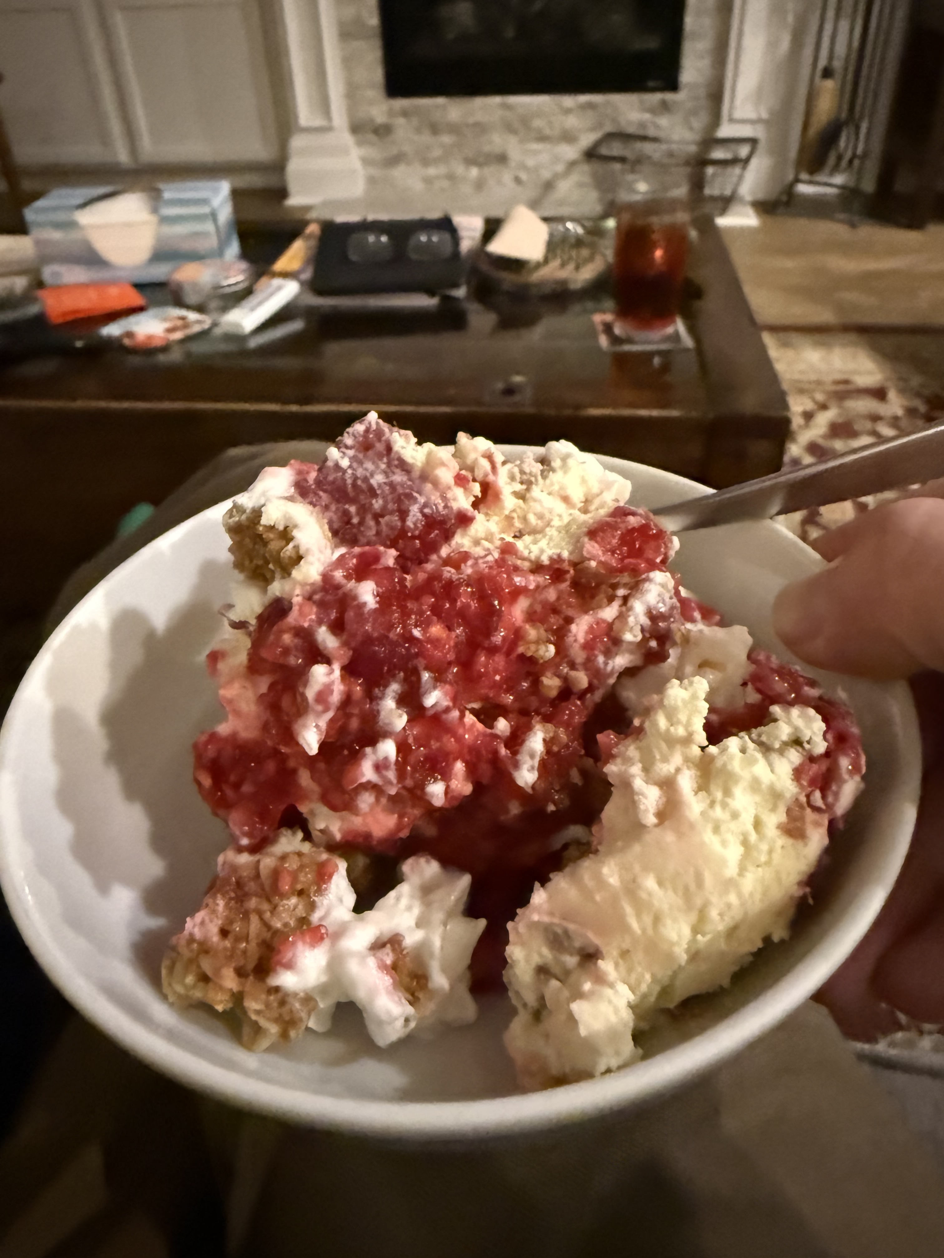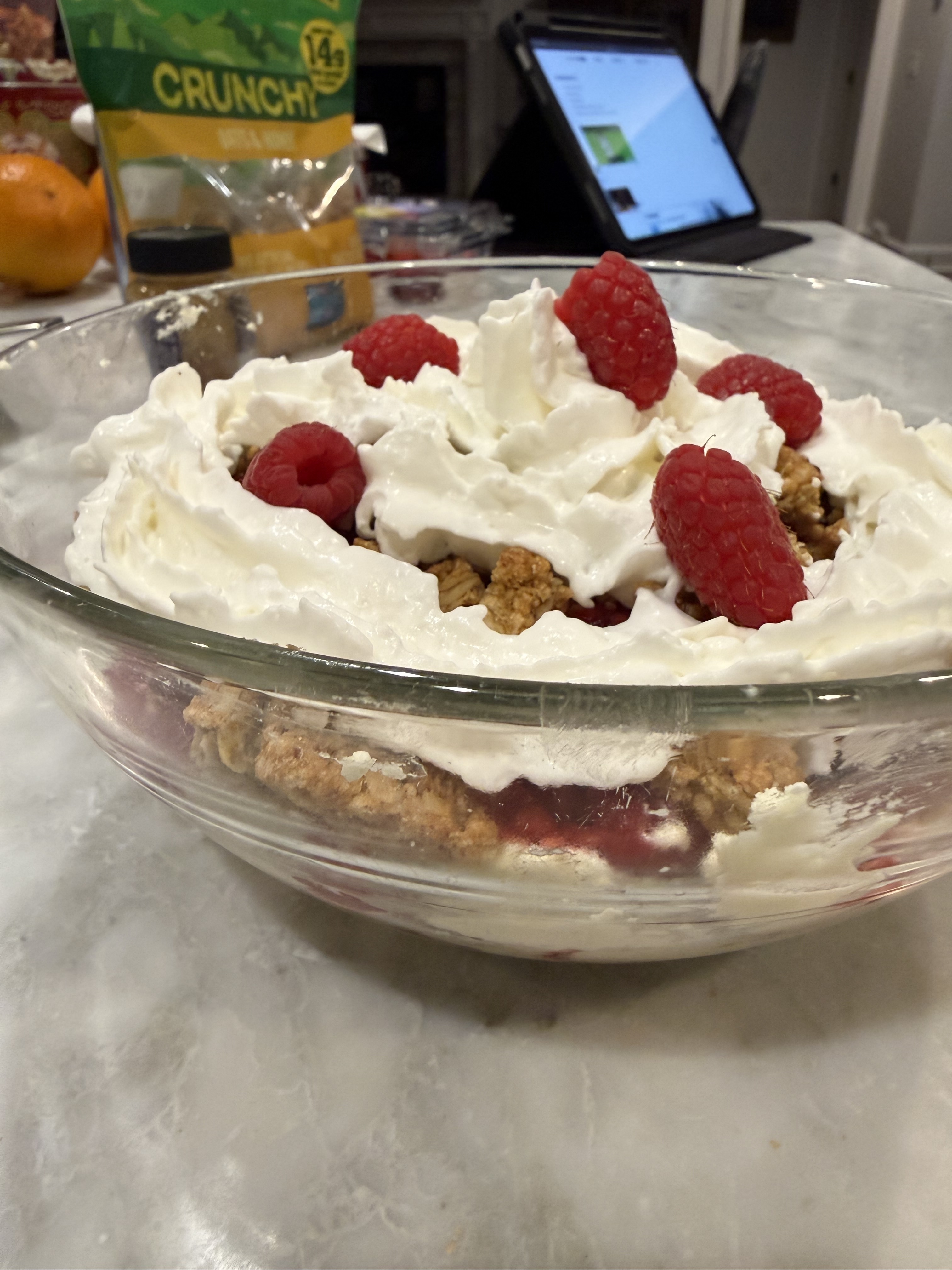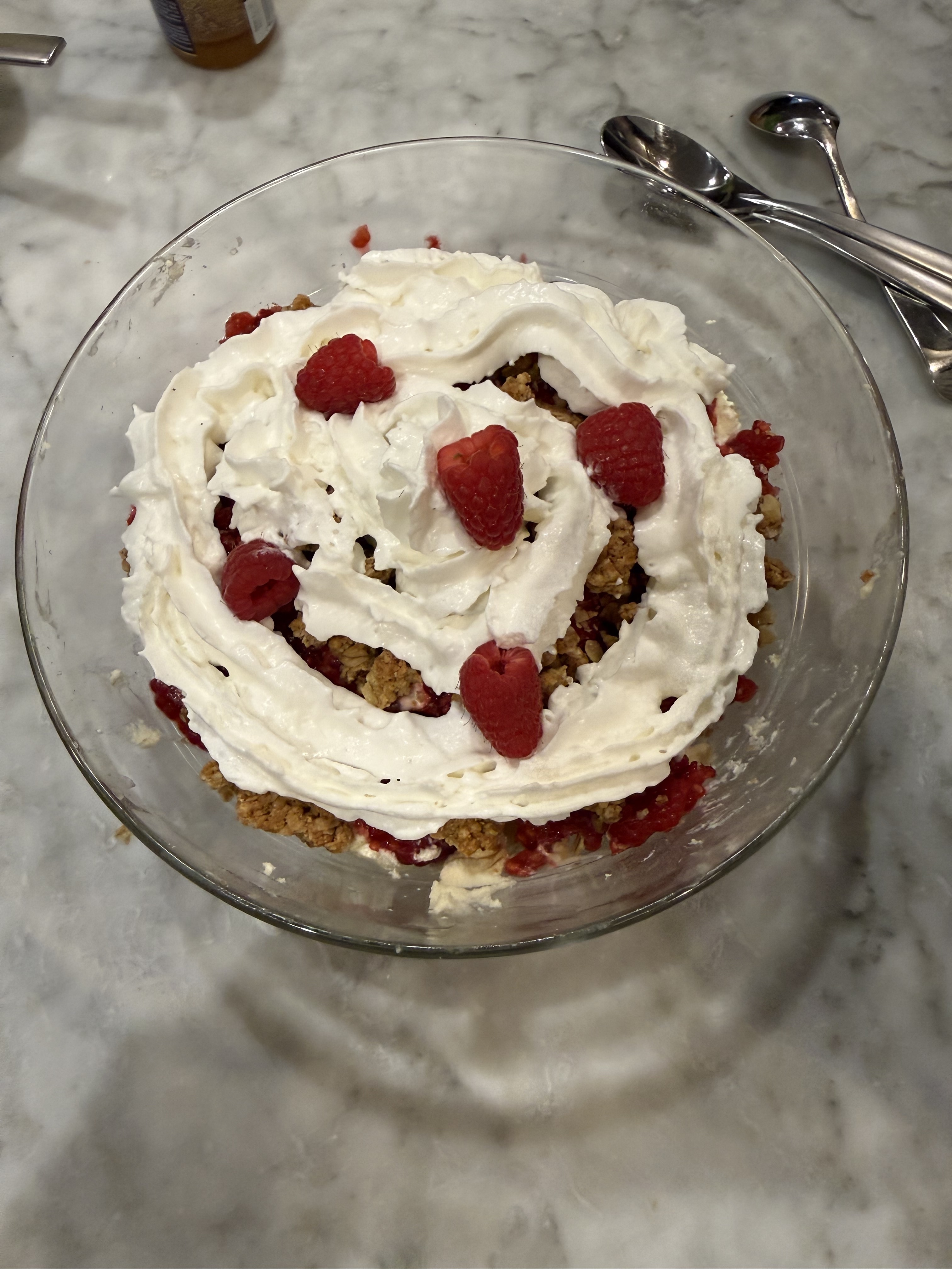 Clotted cream, whiskey, raspberries, honey and oat(granola).https://scottishscran.com/traditional-scottish-cranachan-recipe/