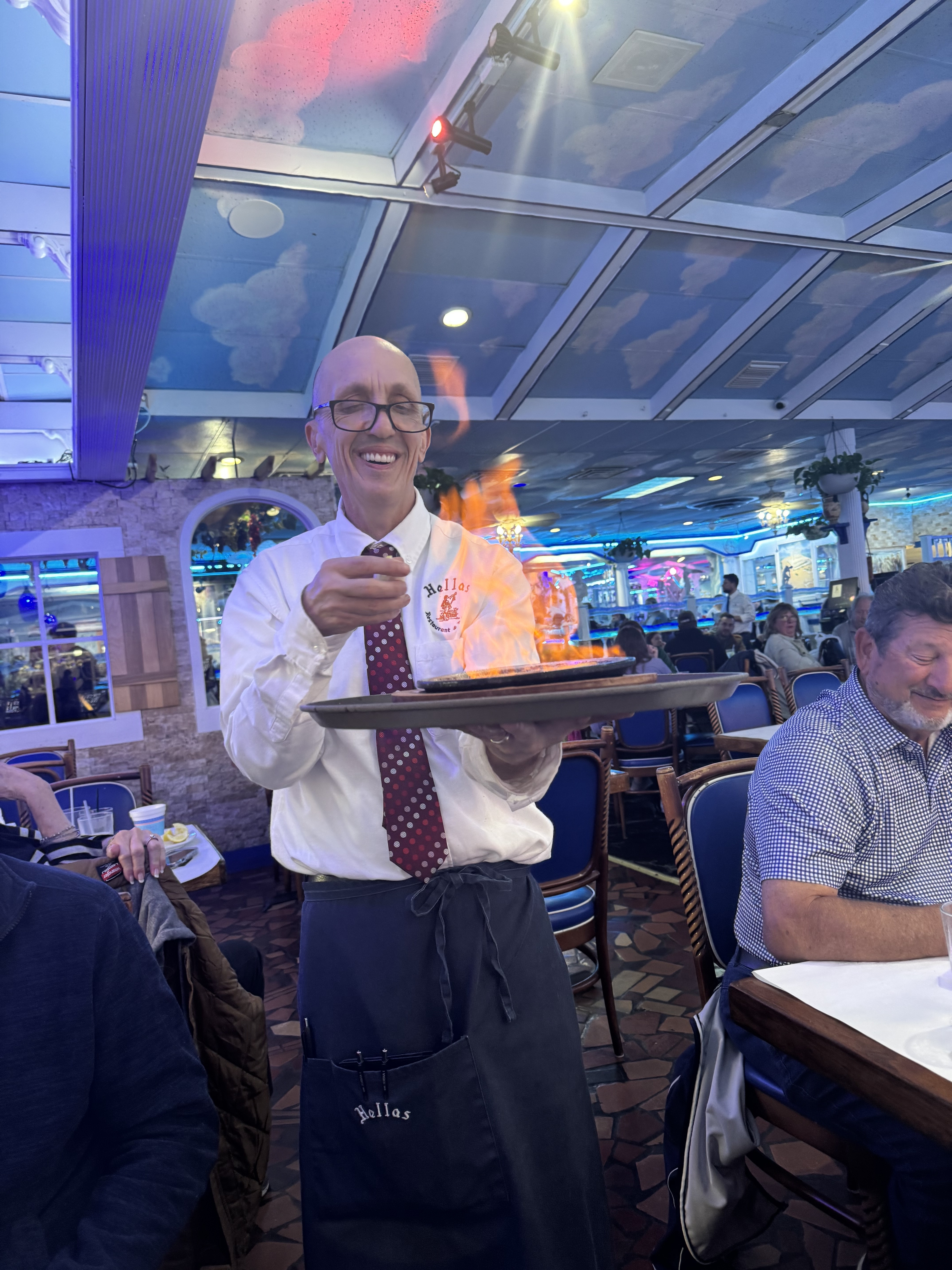 We had Saganaki, a baked cheese that they set on fire tableside.