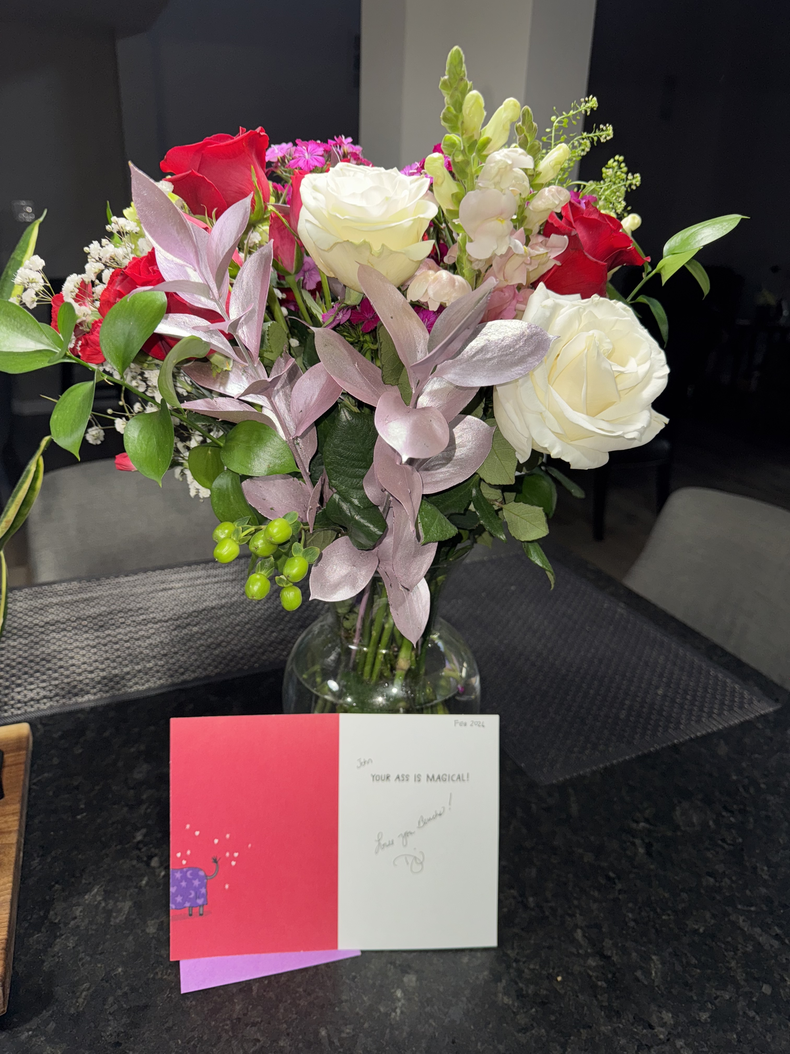 Mi Esposa’s Valentine’s Day Flowers! Changing the water every day helps preserve the beauty! Yes, that’s the card she gave to me! Thanks!