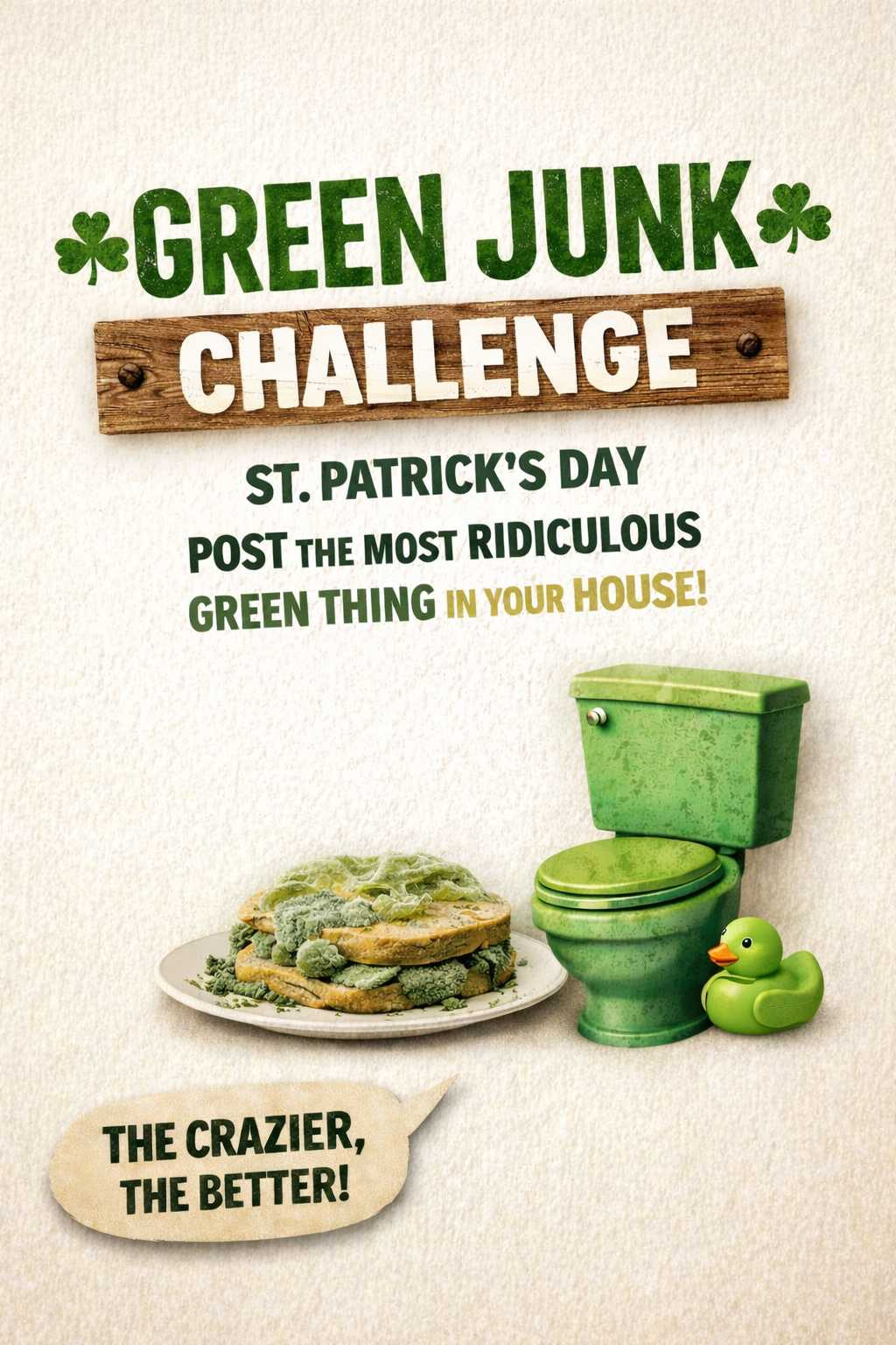 In honor of St. Patrick’s Day, dig through your house and post the most ridiculous green thing you can find. The stranger, the better but keep it family friendly, and non-porny PLEASE. Contest ends March 18 at 12:01 AM. I will pick two random winners to receive Gutter merch.